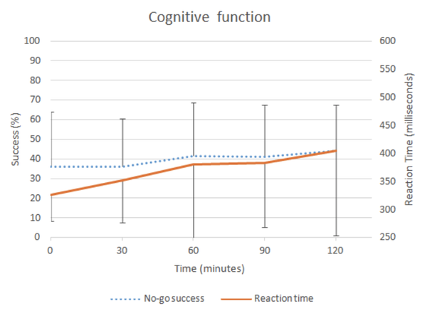 对于认知功能,严重急性呼吸系统综合症的结果显示,在2小时内,反应时间显着减慢了78毫秒,尽管成功率随着时间的推移而增加(从36%增加到44%),但这一趋势在统计学上并不明显(表2和图2)。