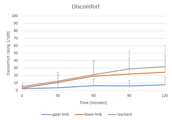 图1:长时间稳定2小时后腰部、下肢区域和上肢区域不一致的平均(标准差)评分