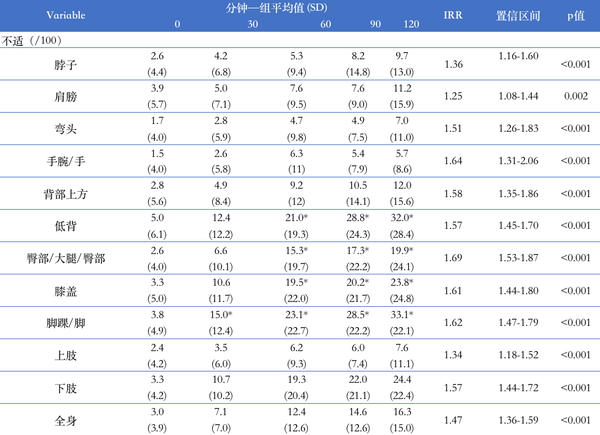 不均匀2小时内,所有身体部位的不均匀感显着增加(见表1)。图1显示了腰部、下肢联合区域和上肢联合区域的不均匀感增加。