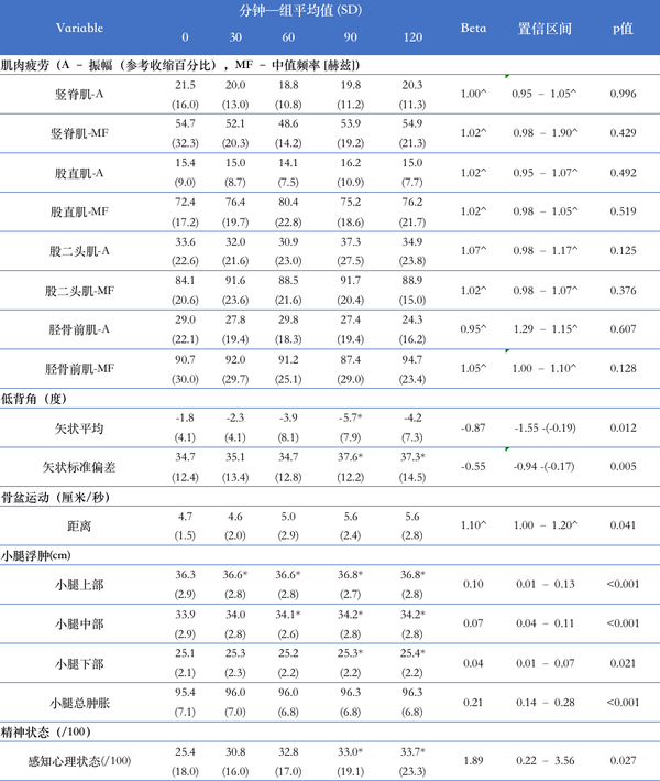 图3说明了时间对胫骨前肌活动幅度(次MAX自主相关收缩长度)和小腿肿胀的影响。两两比较显示精神状态恶化,与90分钟相比存在统计学上的显着差异(β=7.57,p =0.045;120分钟β=8.36,p=0.027)。
