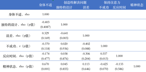 表6:长时间持续2小时以上身体不稳定、创作解决问题、持续注意力和精神状态之间的变化评分相关性(rho)