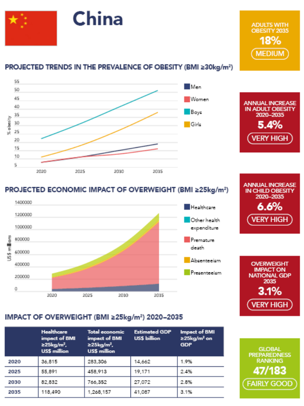 2020年全球肥胖/超重(BMI≥25)的人数为26亿人,预计到2035年,肥胖/超重患病率从2020年的38%增加到51%,全球超过40亿人属于肥胖/超重。