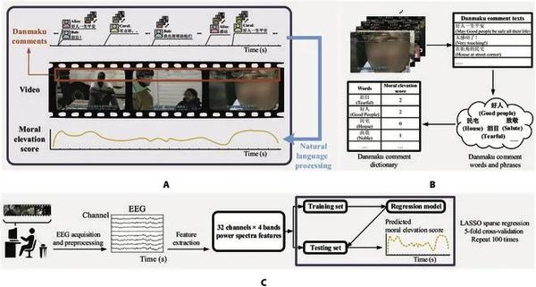 近期,来自清华团队的实验研究人员记录了 23 名参与者观看有望引发道德提升的视频时的脑电图 (EEG) 信号。提取了超过 30,000 条弹幕评论作为众包标记方法,以 1 秒的时间分辨率连续标记道德提升。然后,通过采用功率谱特征和较小*收缩和选择算子正则回归分析,(预测 r = 0.44 ± 0.11)。我们的研究结果表明,使用脑电图信号来解码道德提升是可能的。此外,小样本神经数据可以预测大量人群弹幕评论中所传达的持续道德提升体验。
