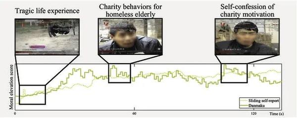 图3显示了根据代表性视频中的弹幕评论和自我报告计算出的道德提升分数的时间动态(>300,000 次观看,>25,000 条弹幕评论)。弹幕评论分数与自我报告分数之间可以观察到类似的趋势(Pearson 相关性r = 0.67,P < 0.001),这表明基于弹幕的道德提升分数的有效性。视频中通过截图突出显示了三个时间段:一阶段介绍了主人公悲惨的身世;二阶段记录了他对无家可归老人的慈善行为;三阶段记录了他慈善动机的自白。