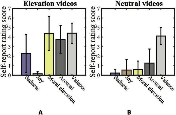 道德提升视频和中立视频的自评评分如图2所示。显示“悲伤”和“快乐”维度是因为这两种情绪在以往的道德提升研究中被较多提及和比较。