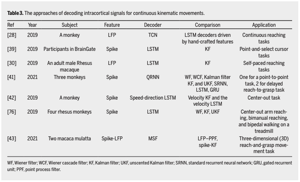 值得注意的是,速度和位置在运动皮层中的编码方式不同,因此,分别解码运动和速度对提高性能具有积极影响。使用同时解码运动和速度的双 LSTM 模型,与速度卡尔曼滤波器以及速度 LSTM 相比,速度方向 LSTM 可以更准确地评估上肢运动变量。因此,将 RNN 及其变体应用于皮质内信号可以提高解码连续运动的性能。以下表格总结了解码连续运动的皮质内信号的方法。