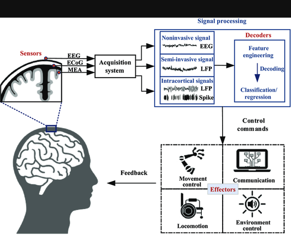 一般来说,传感器或电极记录神经活动,获得的大脑信号由采集系统收集,然后应用设计的算法(解码器)提取特定信号的特征或模式,并将其翻译成命令指令。再提一点,外部设备(效应器)根据指令执行任务并反馈给个体。