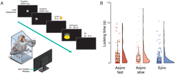 实验使用眼动仪来测量猴子观看图像的时间。如果猴子对自己的心跳有感觉,它们会发现同步弹跳不如不同步弹跳有趣和新颖,因此会花更多时间查看不同步图像。