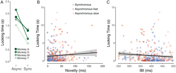 然后,实验播放了黄色或绿色云朵上下弹跳并伴有嘟嘟声的视频。有时我们会同步弹跳和蜂鸣声以匹配猴子的心跳,而有时它们不同步。