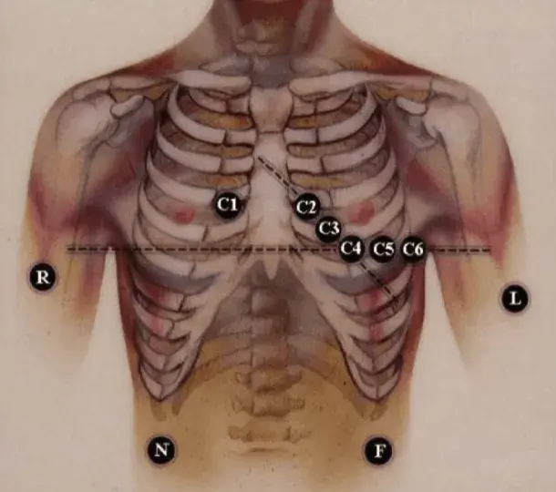 03. 标准12导联心电图:使用至少10个电极从不同的角度记录心电信号。这包括4个四肢导联(肢体导联R、L、N、F)和6个胸部导联(胸导联C1、C2、C3、C4、C5、C6),可以提供对心脏电活动在不同方向上的全面评估。【专业性医学研究偏多】