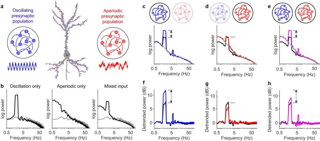 h :振荡和非周期性强度增加之前(黑色)和之后(洋红色)的去趋势功率。请注意,尽管振荡强度增加了相同的量,但2 Hz 处的去趋势功率并未像 ( f)中那样增加那么多。