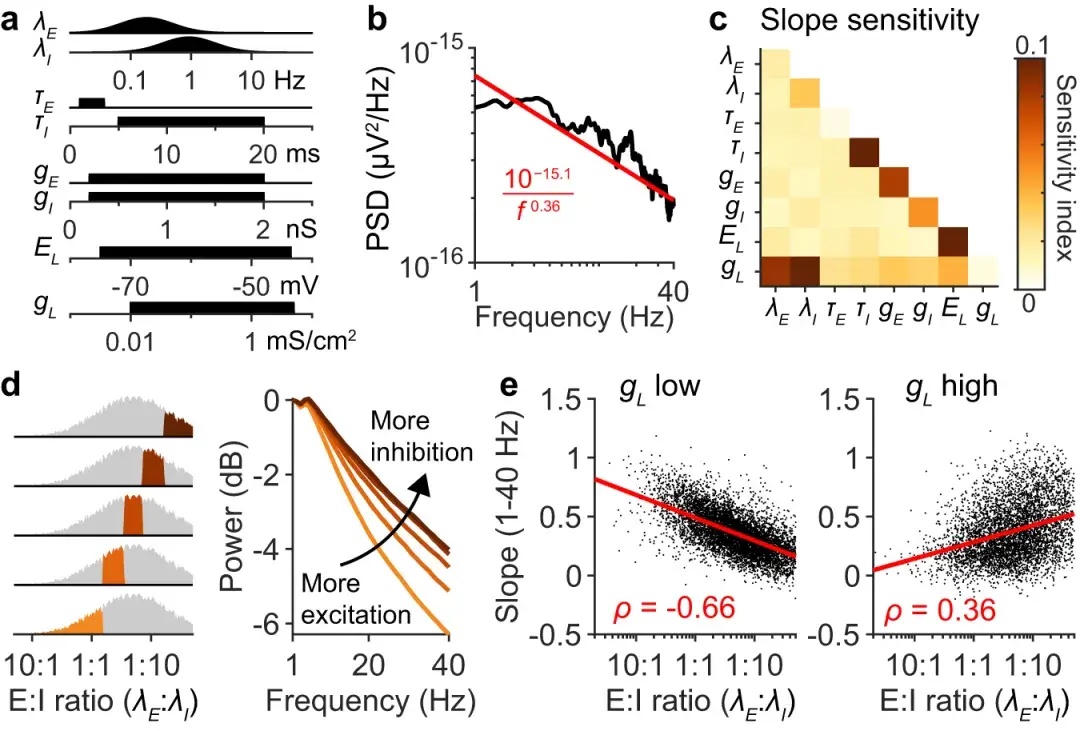 e :频谱斜率根据每次模拟的 E:I 比率绘制。左图:漏电导较低的模拟( mS cm − 2;n = 7366 次模拟)。右图:漏电导较高的模拟( mS cm −2;n = 5184 次模拟)。