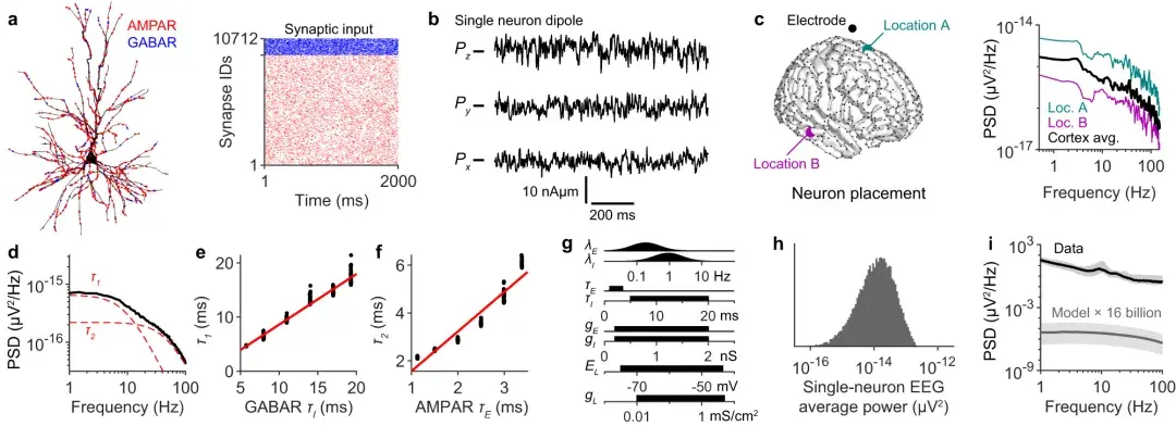 h :单神经元 EEG 功率的分布(如c中的位置平均)基于 20,000 次模拟,参数从 ( g ) 中所示的分布中采样,采样的形态如表1中所述。