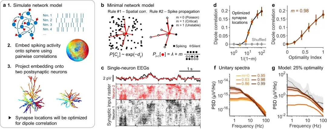 该研究将头皮电位的数值正演模型与单神经元偶极子的生物物理计算结合起来。通过这种方法,实验模拟了由表现出一系列动态的网络生成的生物物理真实脑电图信号。这些模拟揭示了除了大脑节律之外的几种影响脑电图信号并共同塑造频谱趋势的机制。
