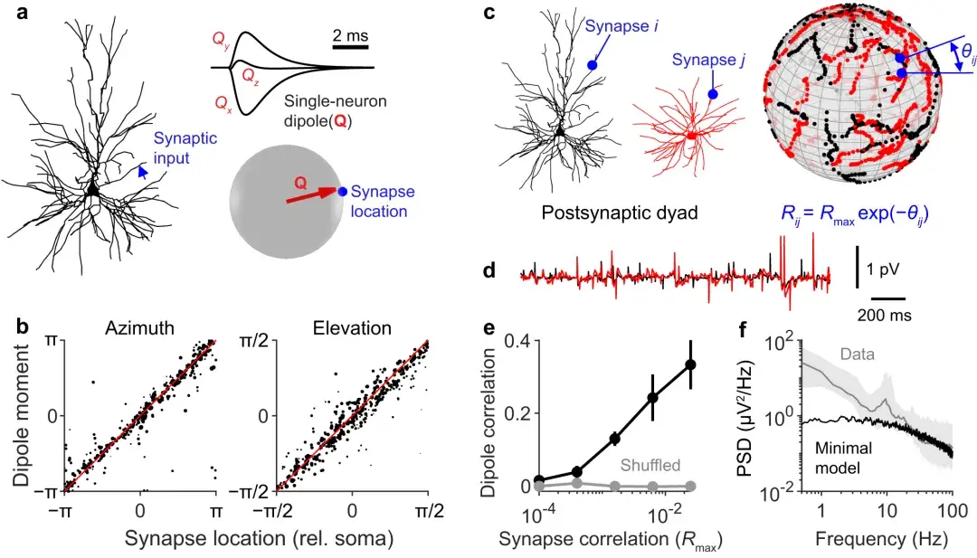 d :(c)中所示的两个神经元的单神经元 EEG 信号示例。e两个单神经元偶极子之间的相关性作为函数。垂直线**平均值的 95% 置信区间(n = 11 个不同的形态对)。当突触位置被打乱时,偶极子不再相关(灰色)。