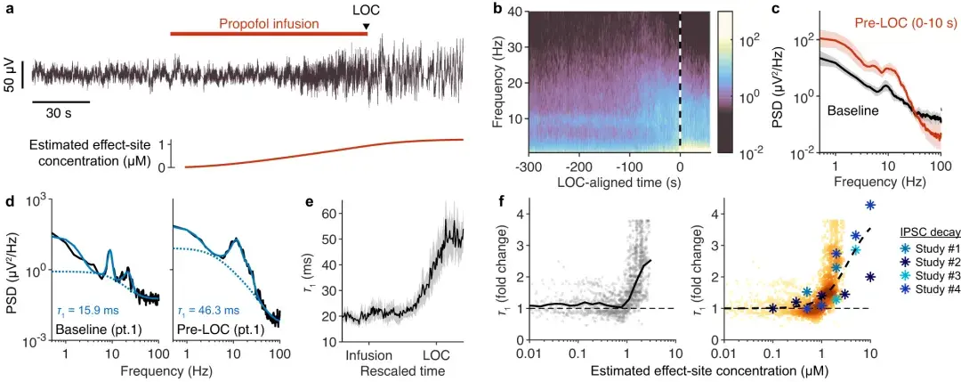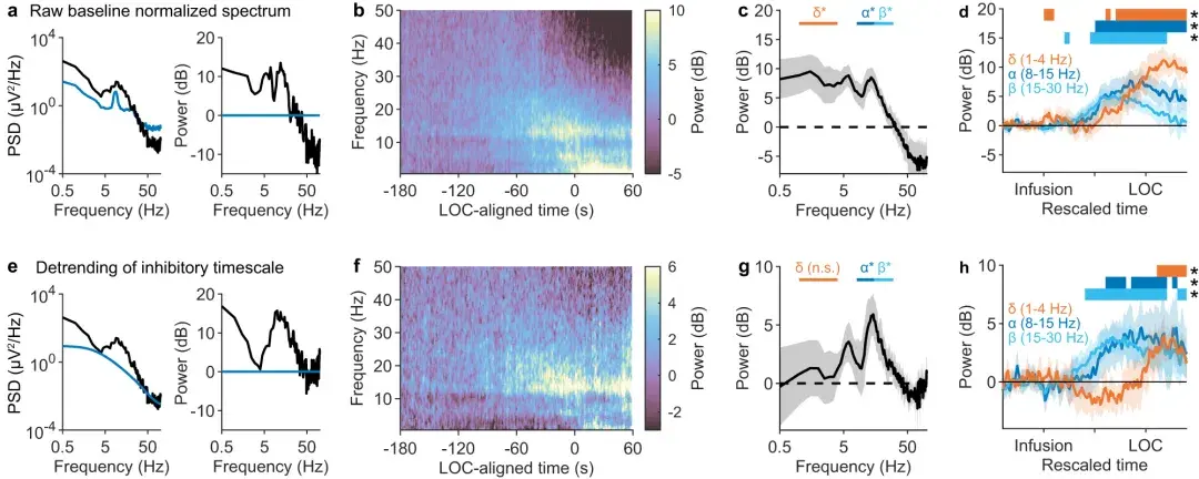 e 左 :LOC 之后的 EEG 频谱,与a相同,叠加有拟合的抑制时间尺度。未显示拟合的高斯峰。e 右 :去趋势功率,定义为相对于拟合抑制时间尺度的功率,以分贝为单位。