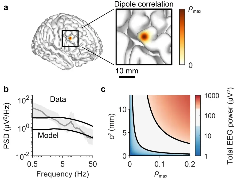 c :由 160 亿个具有偶极子的神经元与 (a)中的内核耦合产生的总模拟 EEG 功率热图和的各种值进行参数化。黑线是水平曲线,**(b)中获得的频谱趋势幅度的下限和上限。