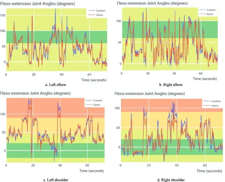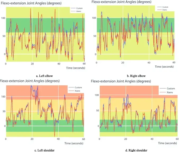 从逆运动学分析可以看出,两个系统(图6和图7)记录的肘关节运动相似,*在某些特定运动上略有不同。*大的角度差异出现在肩关节处(RMSE < 12 度),并且这些差异对于*终 RULA 分数计算并不显着。