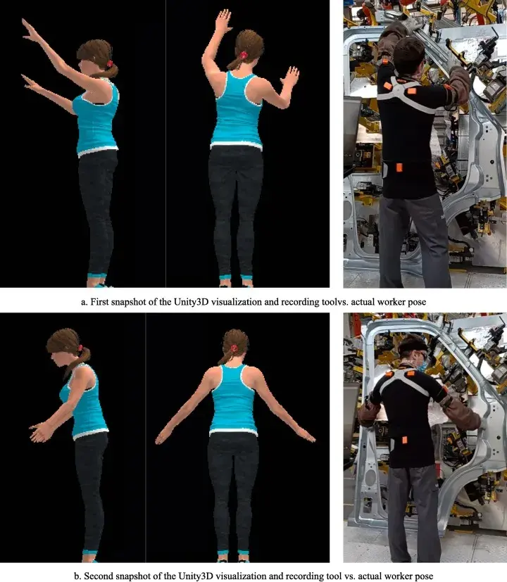 图3:Unity3D 可视化和记录工具的快照(左)和实际工人姿势(右)