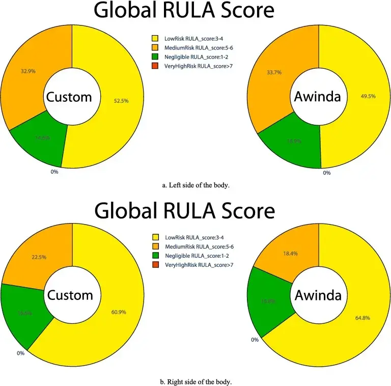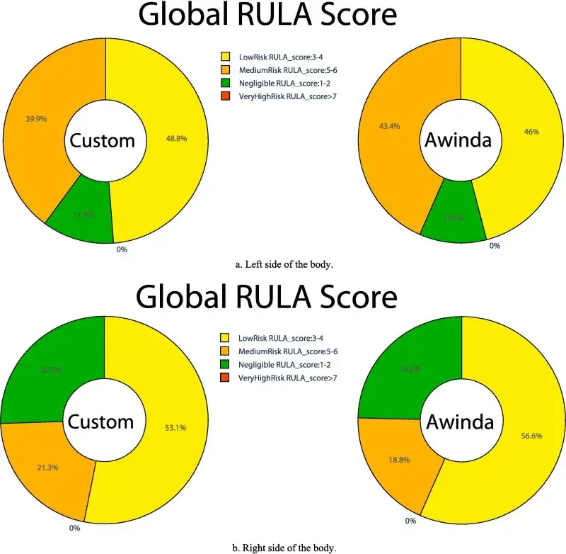 通过添加肘部和肩部得分,并分析总时间内的每个得分范围,研究得出了整体工作站风险。因此,根据建立的关节角度范围,实验可以根据获得的百分比来分析总体受伤风险。该分析被定义为工作周期的全局RULA分数,如图9和图10所示。