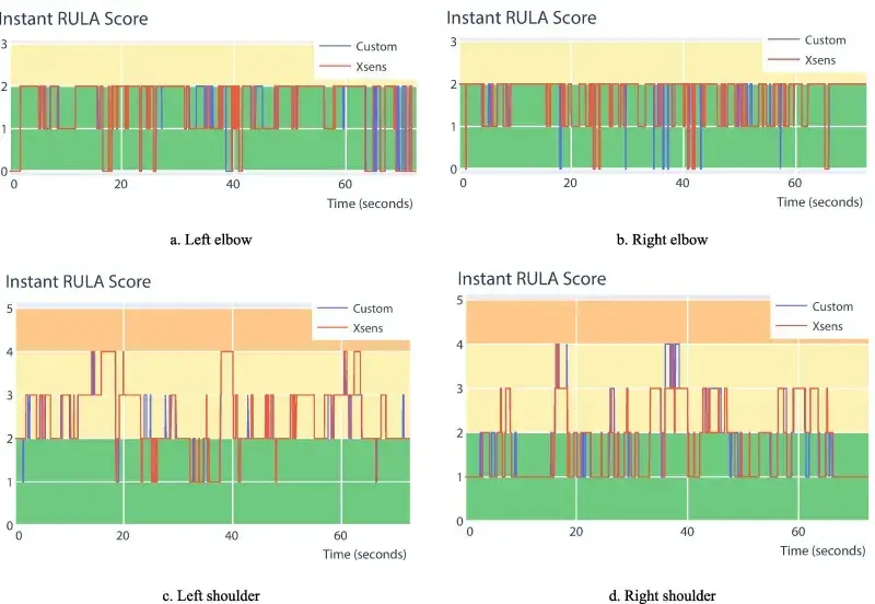 图9:使用通过管道获得的**个子流程记录与来自定制传感器的数据以及商业传感器 (Movella Awinda) 的输出 2 进行全球 RULA 分数的比较