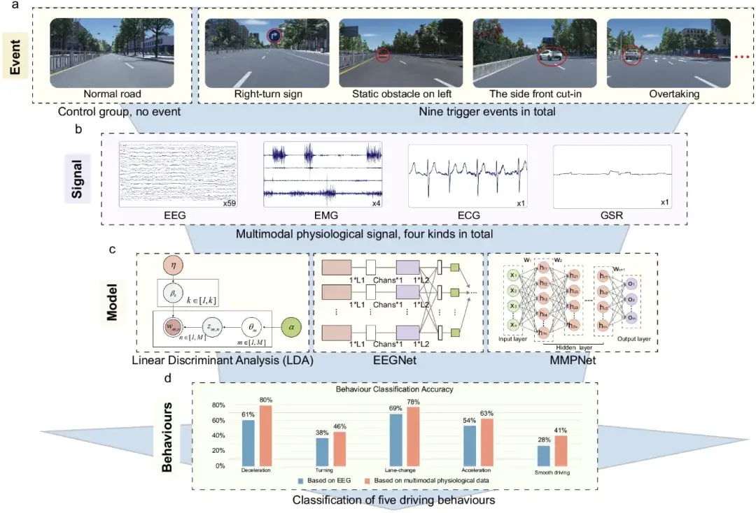 该研究利用从35名参与者收集的多模态生理数据分析驾驶行为,数据包括59通道脑电图、心电图、肌电图、GSR和眼动数据。研究将驾驶行为分为平稳驾驶、加速、减速、变道和转弯。实验确认生理数据和车辆数据均符合要求,并开发了线性判别分析(LDA)、MMPNet和EEGNet分类模型,展示生理数据与驾驶行为的相关性。
