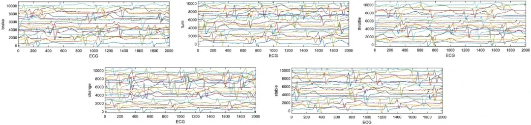 实验采用事件相关行为反应范式,通过事件相关的多模态生理信号对各种驾驶行为进行建模(图2)。实验涵盖平稳驾驶、加速、减速、变道和转弯五类基本驾驶行为,受试者同步采集多模态生理数据(图4)。实验诱发不同驾驶行为并记录相应生理数据,具体行为包括:平稳驾驶(对照组)、加速、减速、变道和转弯。行为触发事件包括超车、前车急刹、行人过马路等,保证样本数量均衡(表2)。