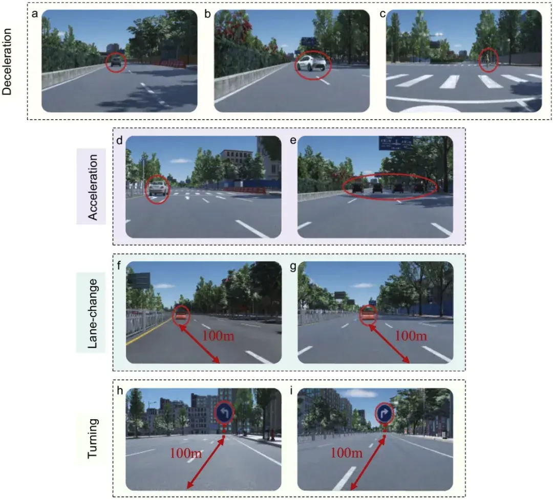 静态障碍物:前方有静态障碍物,驾驶员需换道,时间标记在主车进入换道区域时,距离障碍物约100m(图5f, g)。