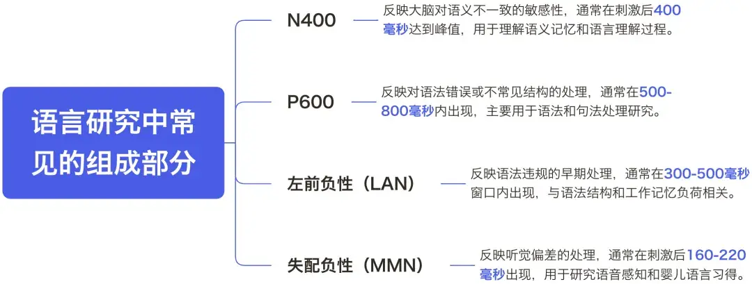 ERP能够以高采样率连续记录数据,与语言理解速度相匹配,这使得实时和在线语言处理的研究成为可能。