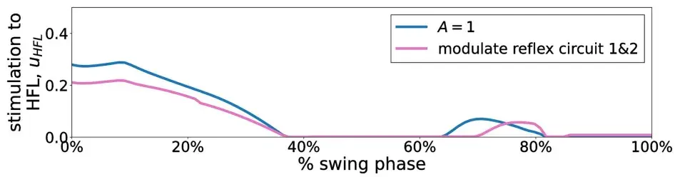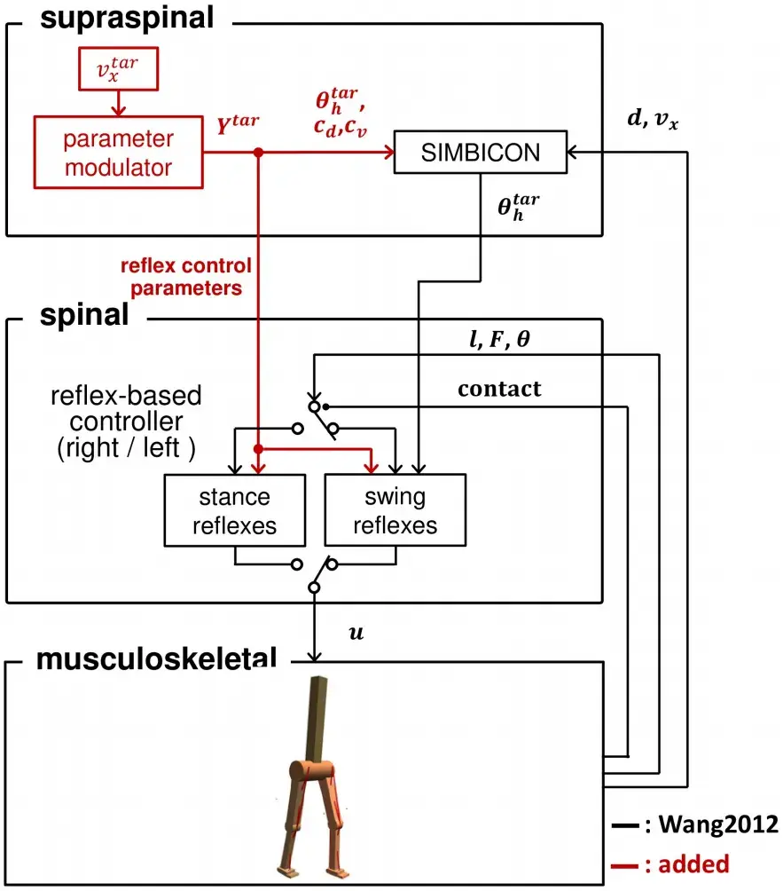 肌肉骨骼模型由激活的肌肉驱动,这些肌肉接收来自脊髓层中基于反射的控制器的刺激信号u。每条腿(右腿和左腿)由单独的站立和摆动反射控制。控制律根据腿是否接触地面而切换。来自模型的传感信息反馈给控制器以产生运动。脊髓上层控制步行速度并调整所需的脚部位置。