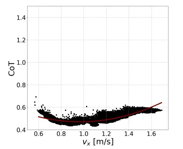 当目标速度改变时,优化参数被重置,部分变量保留。如果模型在评估试验中保持行走,速度、控制参数和 CoT 会被添加到数据集中,数据集按速度排序。