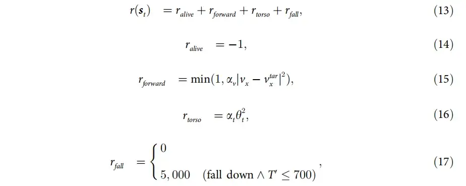 其中ralive可防止模型跌倒。rforward 表示当前水平行走速度 vx 与目标速度之间的差异的惩罚,