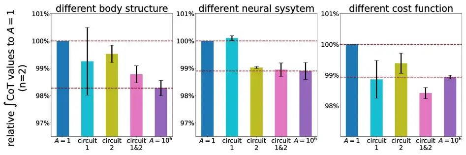 右图:具有不同A值的生成步态的相对 ∫CoT 值( n = 3)。