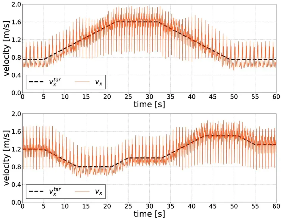 一个程序从目标速度 1.3 米/秒开始逐渐增加,另一个程序从 1.2 米/秒开始逐渐减少,初始控制参数相同。控制参数 Y 针对每个目标速度进行优化,生成步态。