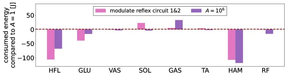 这张图展示了在调节反射电路 (n = 3) 时,相对于基准值 A = 1 的步行 ∫CoT 值的变化。图中用不同颜色条表示不同的优化条件和参数对步态的影响。具体来说: