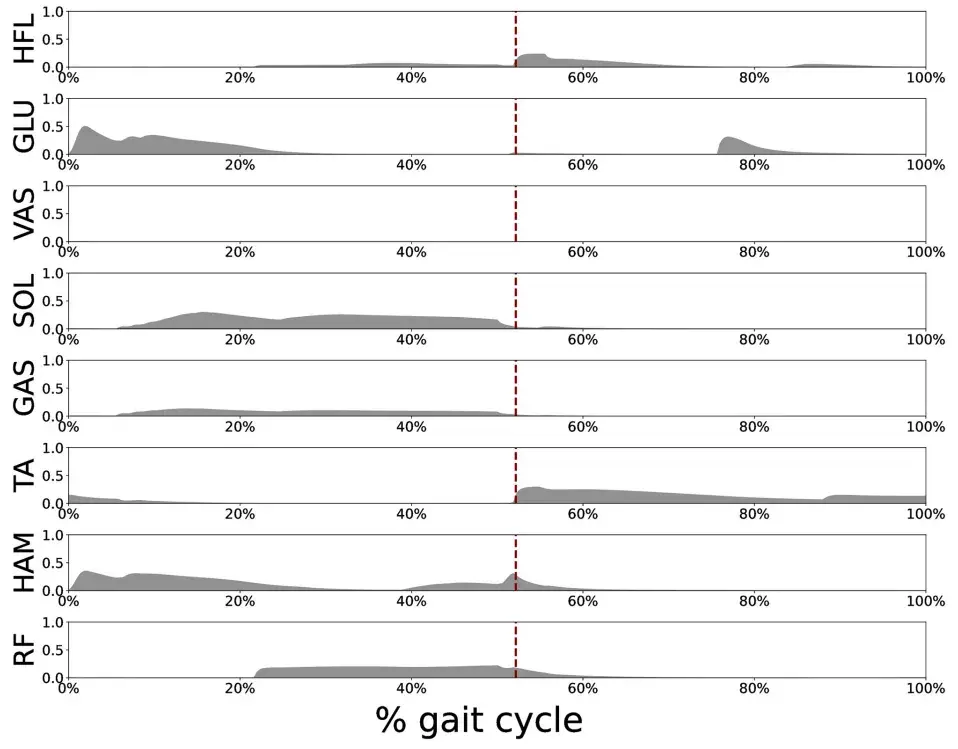 模型包含12个部分:躯干、髋部、两条大腿、两条膝盖、两条小腿、两只脚和两组脚趾,运动限制在矢状面内。每条腿有八个肌肉致动器,反映了臀大肌(GLU)、髋屈肌(HFL)、股四头肌(VAS)、胫前肌(TA)、比目鱼肌(SOL)、腘绳肌(HAM)、股直肌(RF)和腓肠肌(GAS)的肌肉活动。