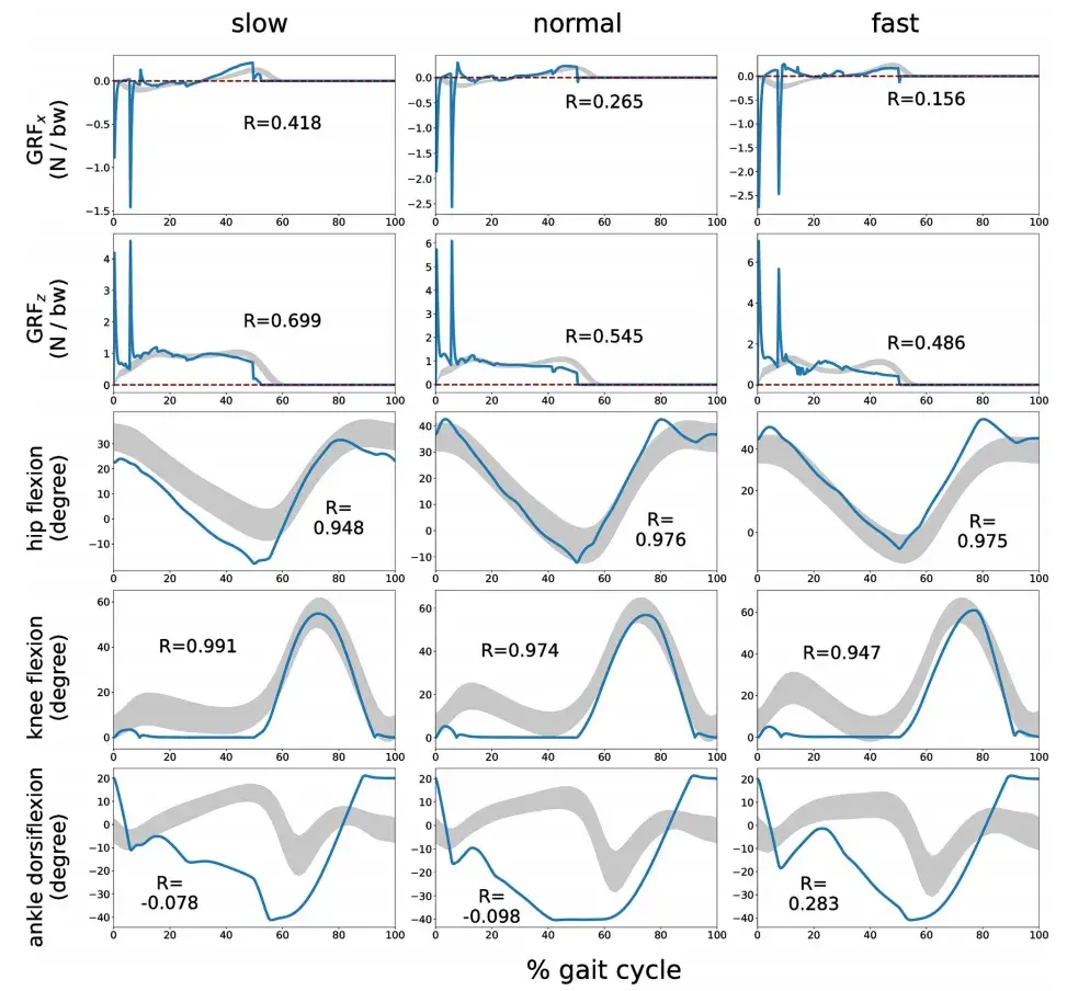 蓝线表示生成的步态,灰线表示人类的步态(平均值±1 sd)。GRF 值根据体重进行归一化。R表示互相关值。2)速度控制