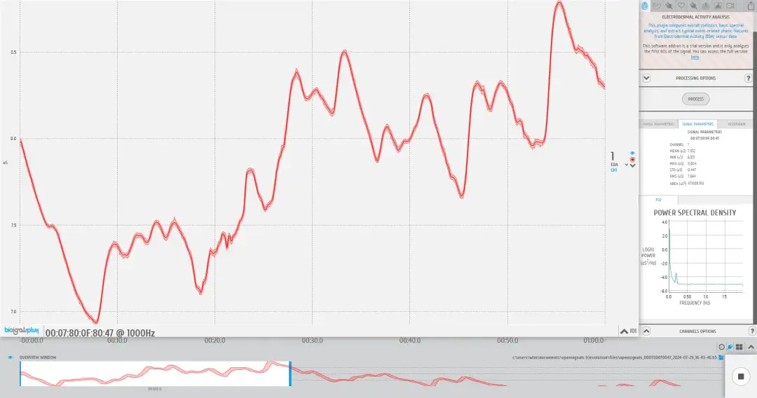 1)皮肤电导水平(Skin Conductance Level, SCL):反映皮肤电导的基线水平,表示在一段时间内的平均皮肤电导值。SCL用于评估个体的整体生理激活状态。