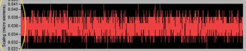 无信号如上图所示,线条特别粗且数值在0左右,有可能是无信号或者低振幅信号,可以用呼吸测试(既让被试深呼吸观察被试皮肤电反应)来区分,若深呼吸后还是无起伏,即为无信号。