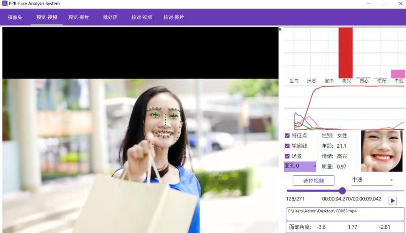 PPB-FAS面部表情分析系统是北京京显数字技术有限公司自主研发的一款专业级的面部表情分析软件,可以实时自动分析高兴、伤心、害怕、厌恶、惊讶、生气、中性等基本面部表情。能够在动态条件下进行面部锁定,从而对面部情绪进行分析。另外还支持性别,年龄等人口统计学信息获取。用户使用该系统能够客观地评估个人的情绪变化,可以提供精确的数据输出用于学习或研究方面。