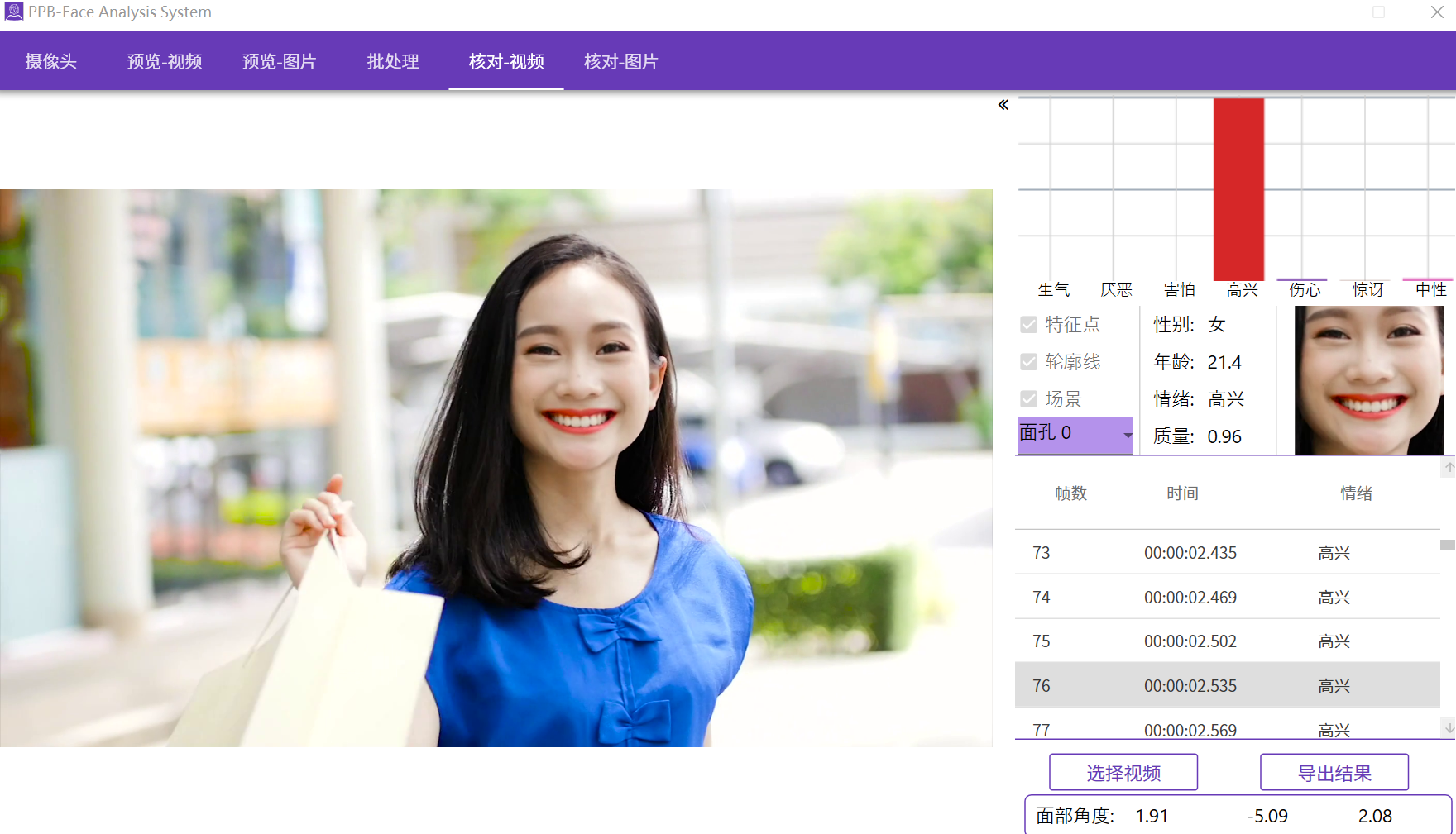 3.面部特征数据提取--面部表情分析数据结果显示和数据输出。