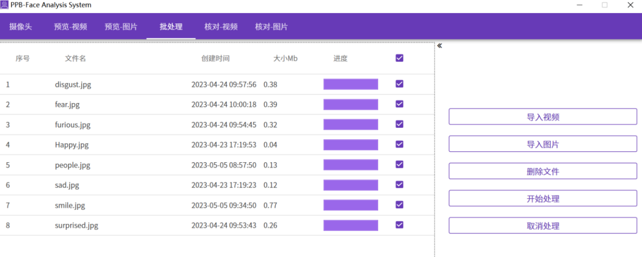 3. 支持外部视频源(avi,mp4)和图片(bmp,jpg,png,jpeg)批量导入功能,方便对视频和图片进行集中处理,一键式快速实现面部表情,头部角度,年龄等分析。