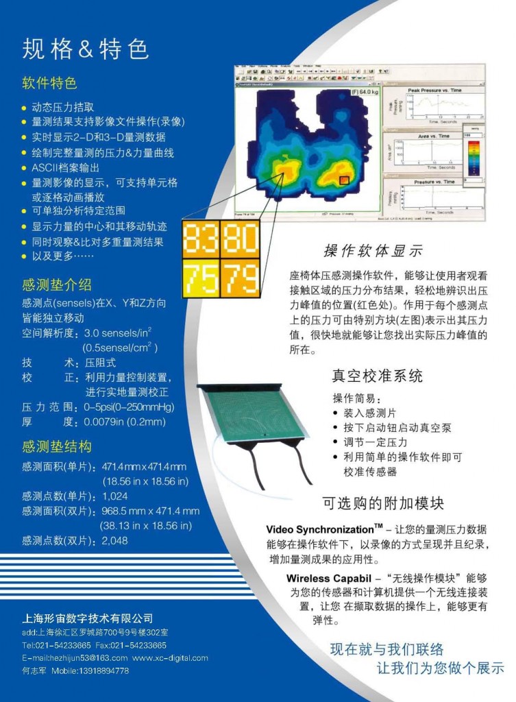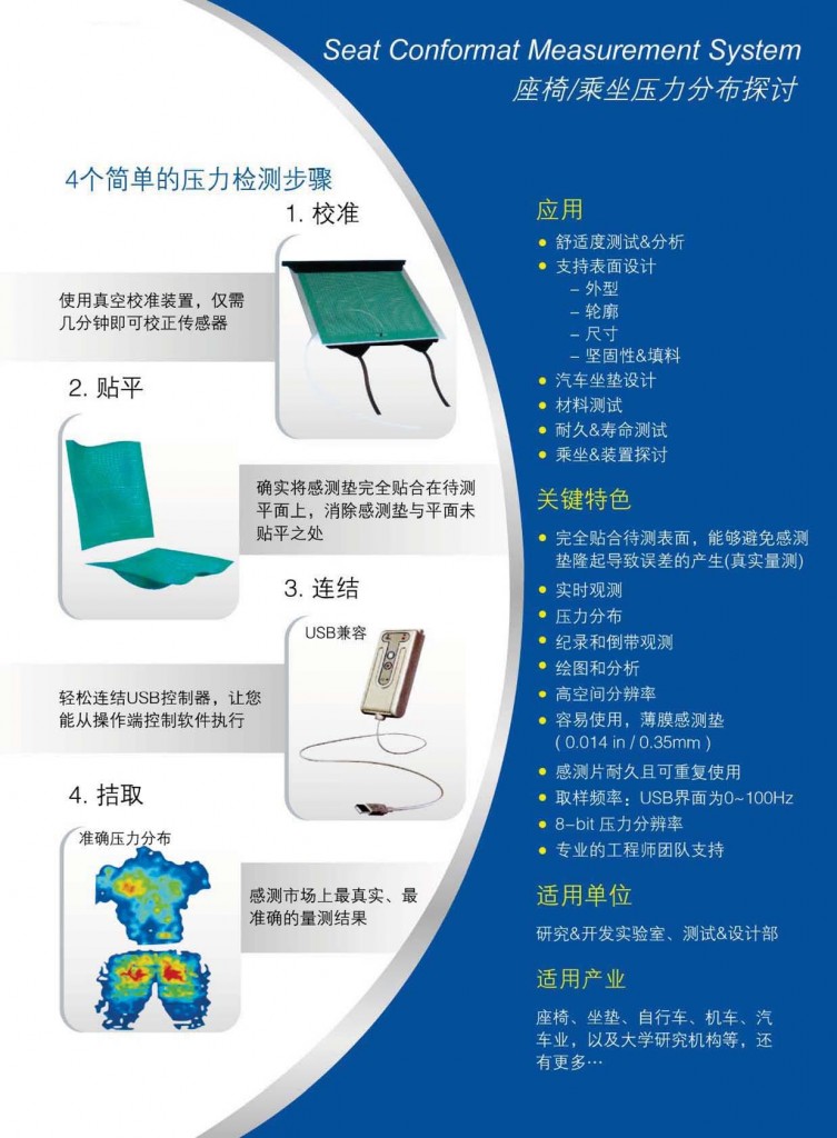 本系统广泛用于量测人体在汽车座椅和办公椅上的压力分布情况。获取的信息可以用来改进座椅的设计,提高舒适性。系统不仅可以获得动态数据,还具有极强的便携性,所以在行驶的汽车里测量与在实验室里测量一样简便。