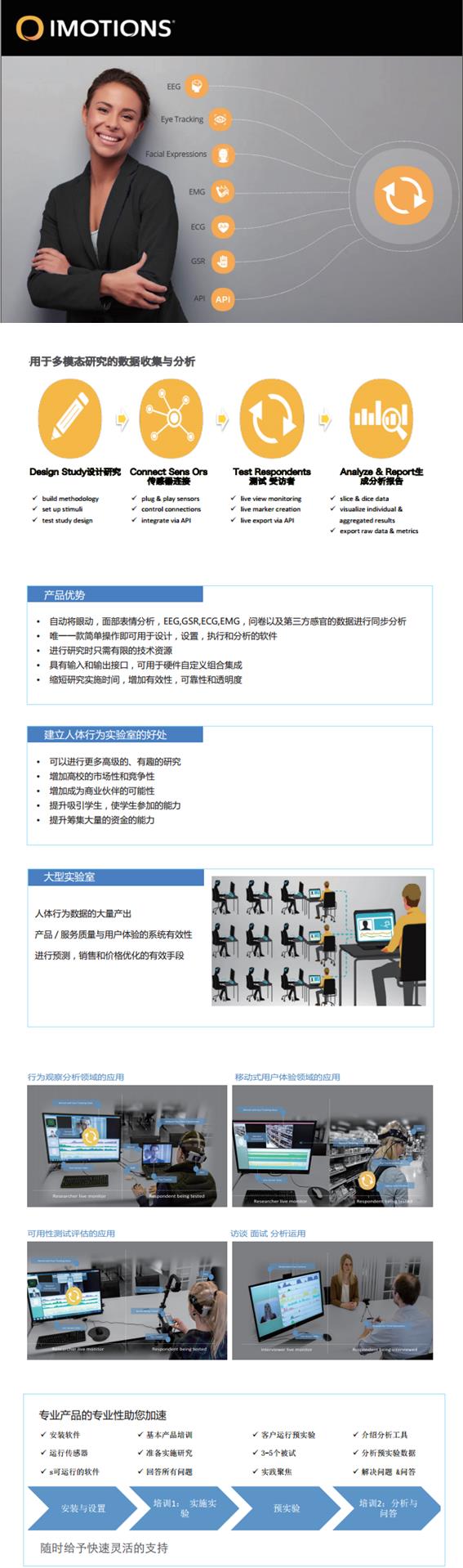 iMOTIONS多模态整合记录分析平台通过简单操作即可用于设计、设置、执行和分析的系统,可自动将眼动、面部表情分析、EEG、GSR、ECG、EMG、问卷以及第三方感官的数据进行同步分析,为认知研究的发展提供了进一步的技术可行性;进行研究时只需有限的技术资源;具有输入和输出接口,可用于硬件自定义组合集成;缩短研究实施时间,增加有效性,可靠性和透明度;可广泛用于神经管理、营销、传播学、认知科学、医学、脑机接口等各个领域。