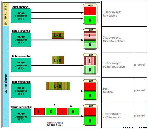 使用头戴式显示器,有两种原理方法可将视频信息传送至显示器:被动模式(左眼和右眼的信息是相似的)主动模式(减少线缆和带宽)