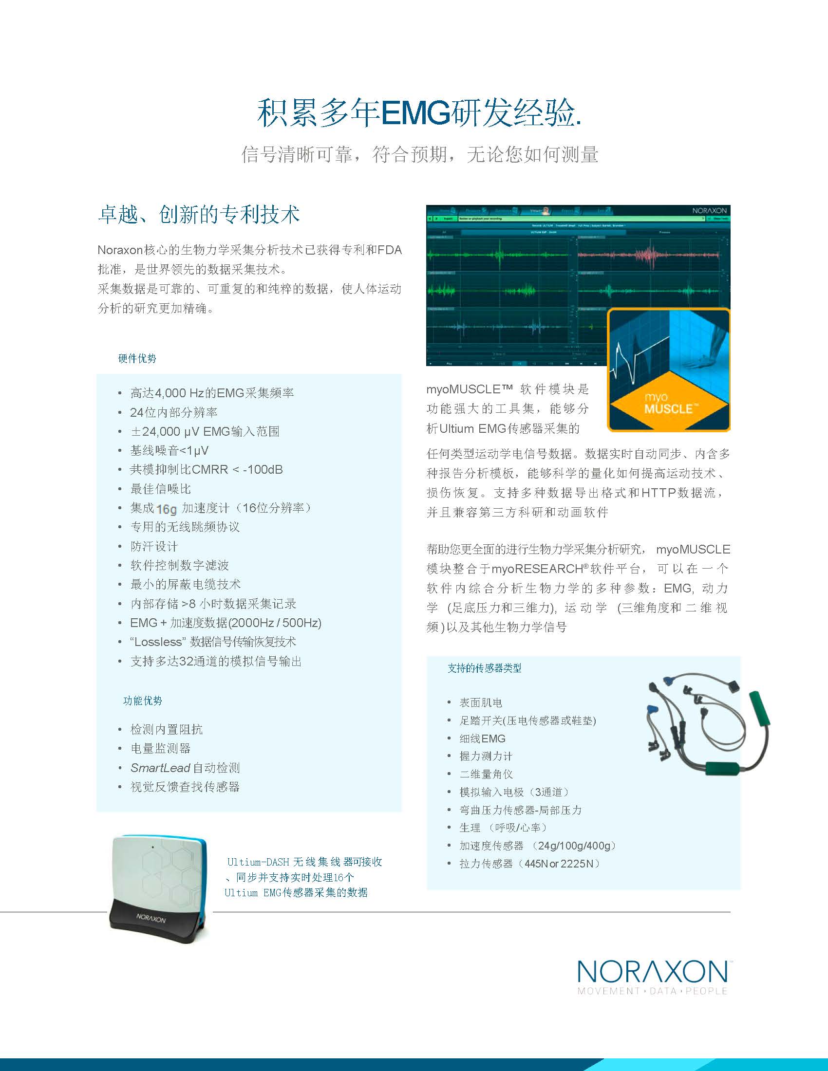 Ultium EMG是优化、精确的EMG采集分析系统 以世界 领先水平的肌电技术为核心,正在申请专 利的“smartlead”数据采集传输技术,智能化多模态的 EMG无线信号传输系统,支持几乎任何硬件、任何类型 的电子信号.