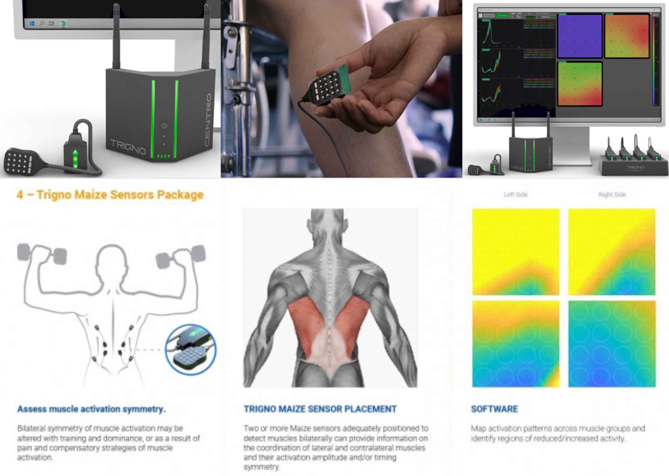 TrignoMaize每个传感器16通道肌电数据,对矩阵肌电信号进行深层次解析,可分解运动单元参与收缩的数量、募集状态与活动次序。此外,还可分析肌电激活空间地形图及肌纤维传导速度。