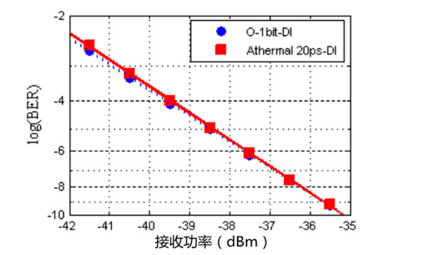 使用 20ps-DI 获得的眼图与使用 1 位 DI 获得的眼图显示了几乎相同的开眼情况。图 4 显示了使用光学预放大接收器的相应误码率性能。热敏 DI 的性能与温控 1 位 DI 基本相同。我们的仿真结果表明,对于 NRZ-DPSK 而言,20ps-DI 的比特周期与 ∆t 之间的完美匹配所造成的损失约为 0.2 dB。与 1 位 DI 相比,测量的惩罚较小,这可能是因为其 PDFS 较小。