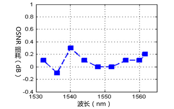 图 6. 测量到的 C 波段 42.7 Gb/s NRZDPSK 信号的 OSNR 损耗。信道使用波形计设置在 ITU 网格上。