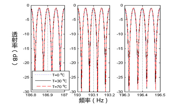 图 2. 在 0°、30° 和 70°C 温度条件下,50-GHz 全热 DI 的构造端口测量到的传输曲线。